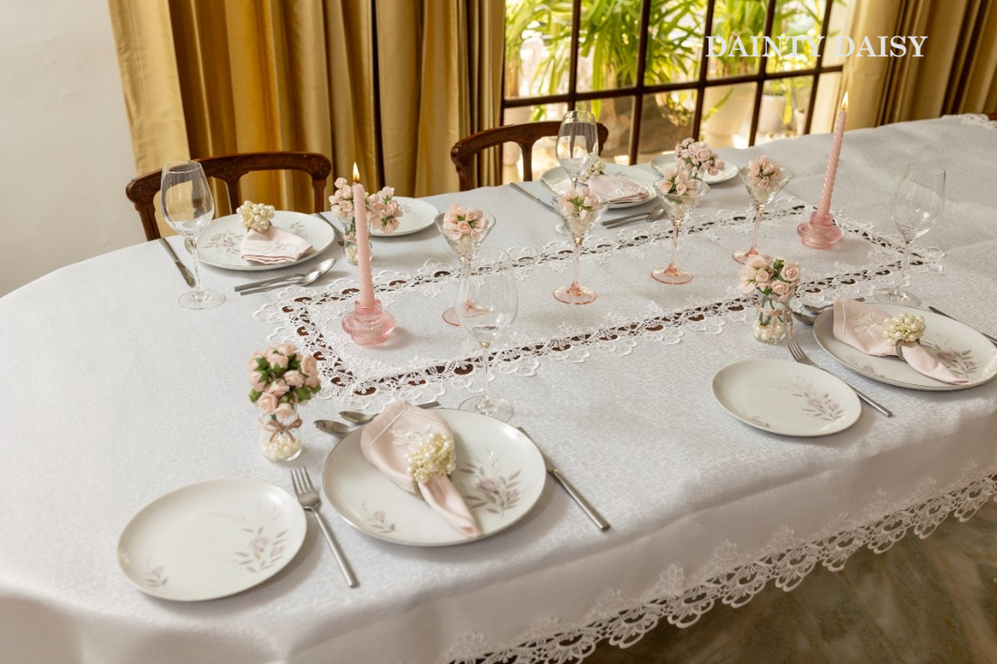 Dine in luxury and style with Dainty Daisy's stunning jacquard and lace table spread. MRP...