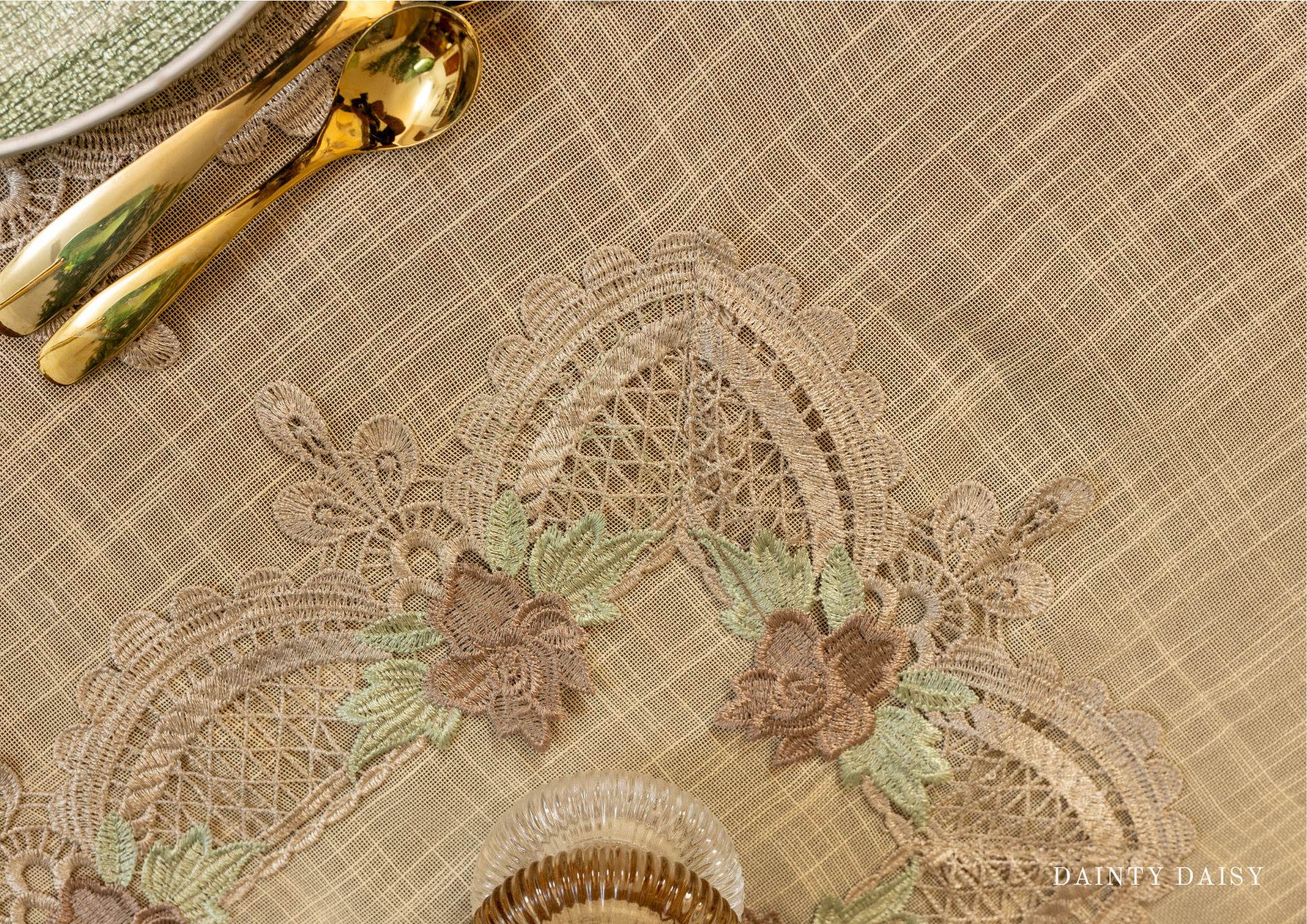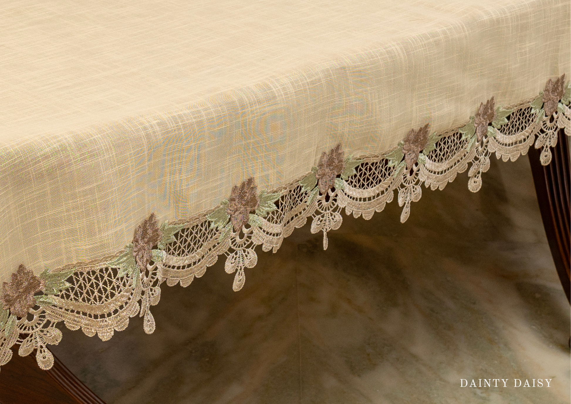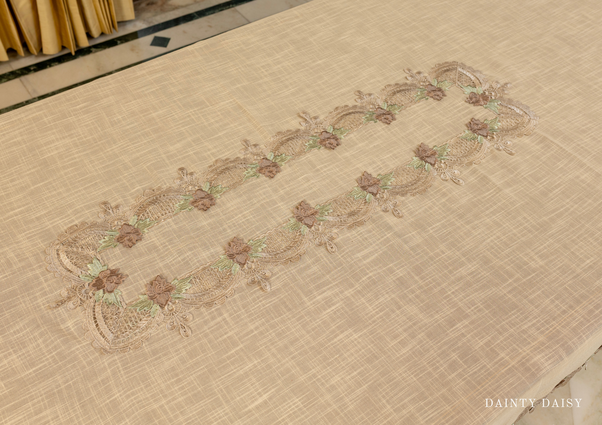 Extend your hospitality with this spacious tablecloth in our signature warm coffee-toffee. Dainty Daisy ensures a refined backdrop for memorable feasts.
