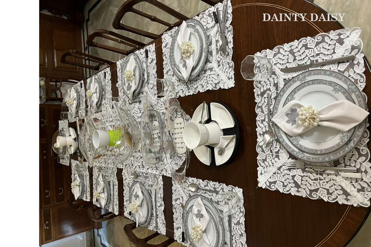 Enjoy elegant entertaining with Dainty Daisy’s pristine runners and placemats.