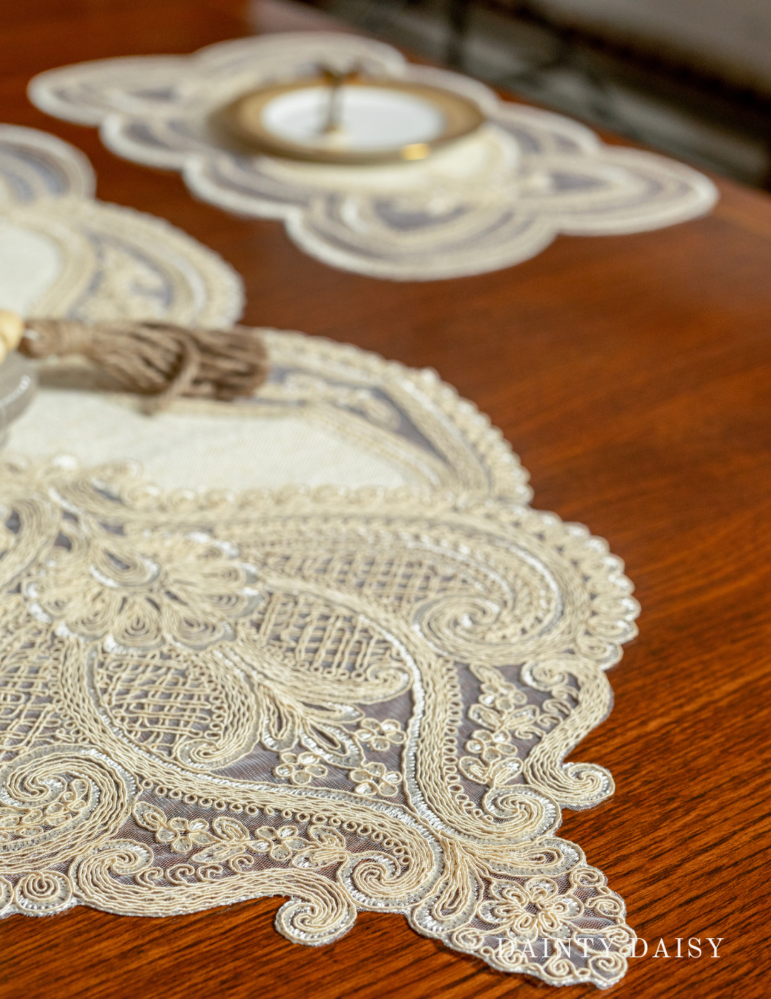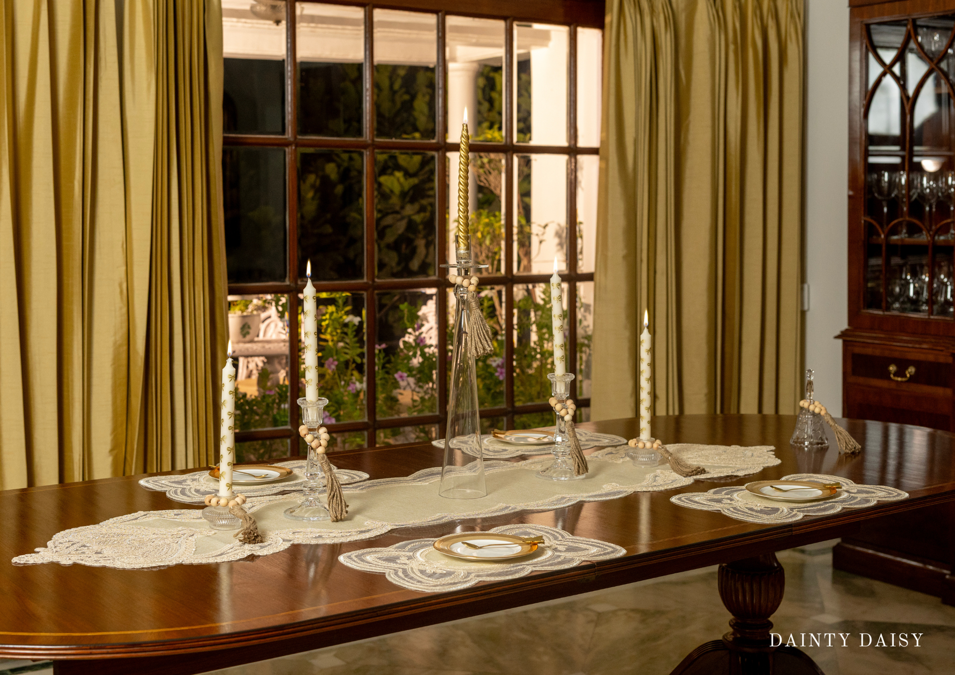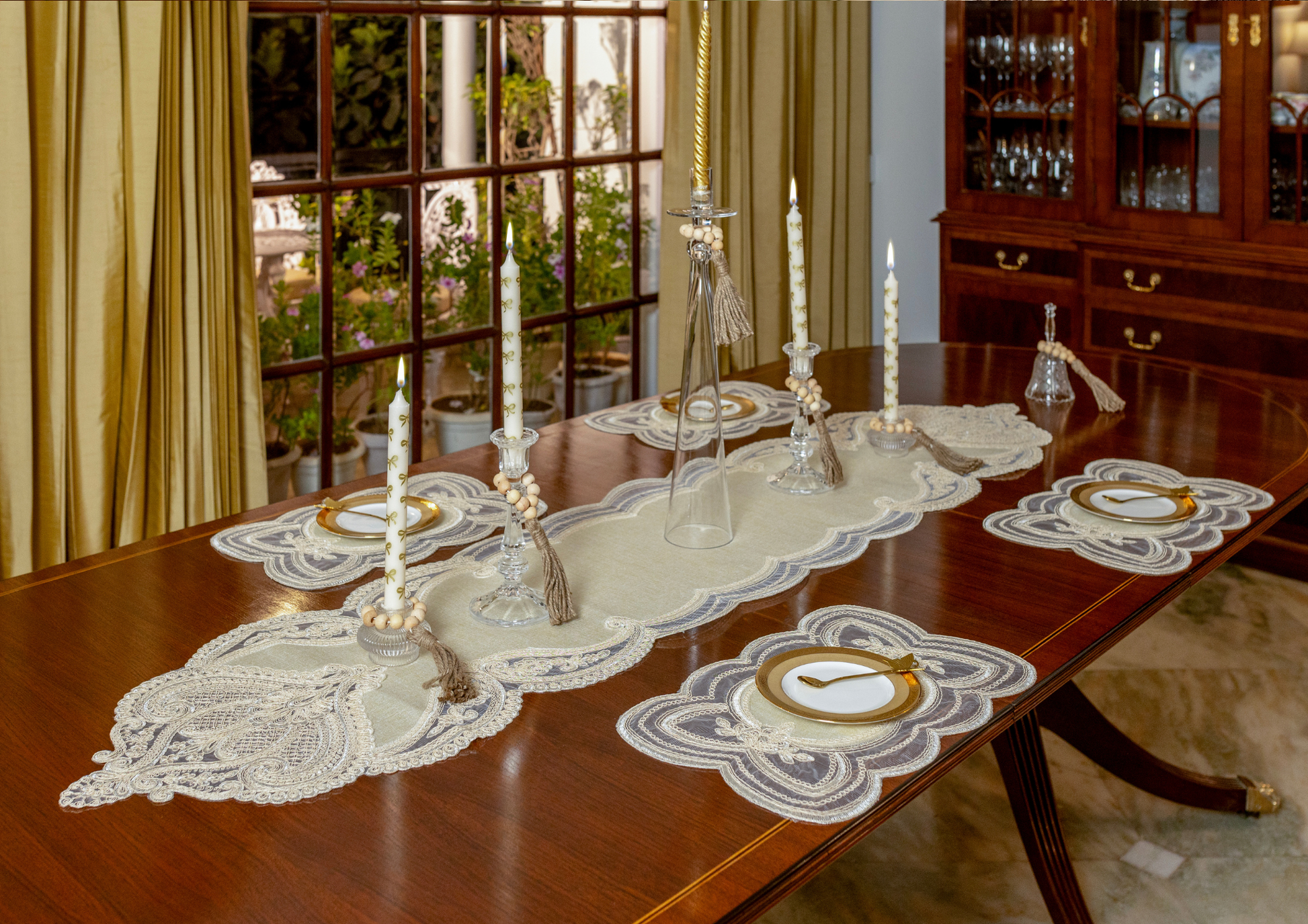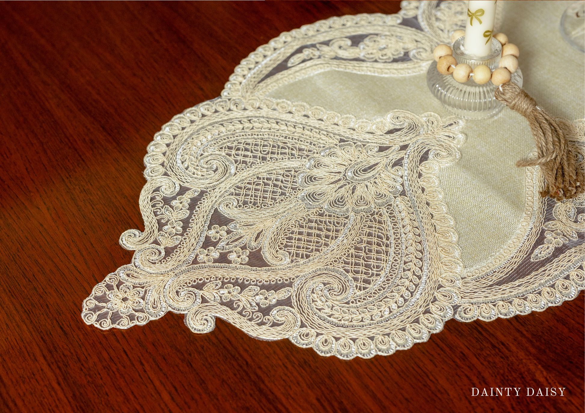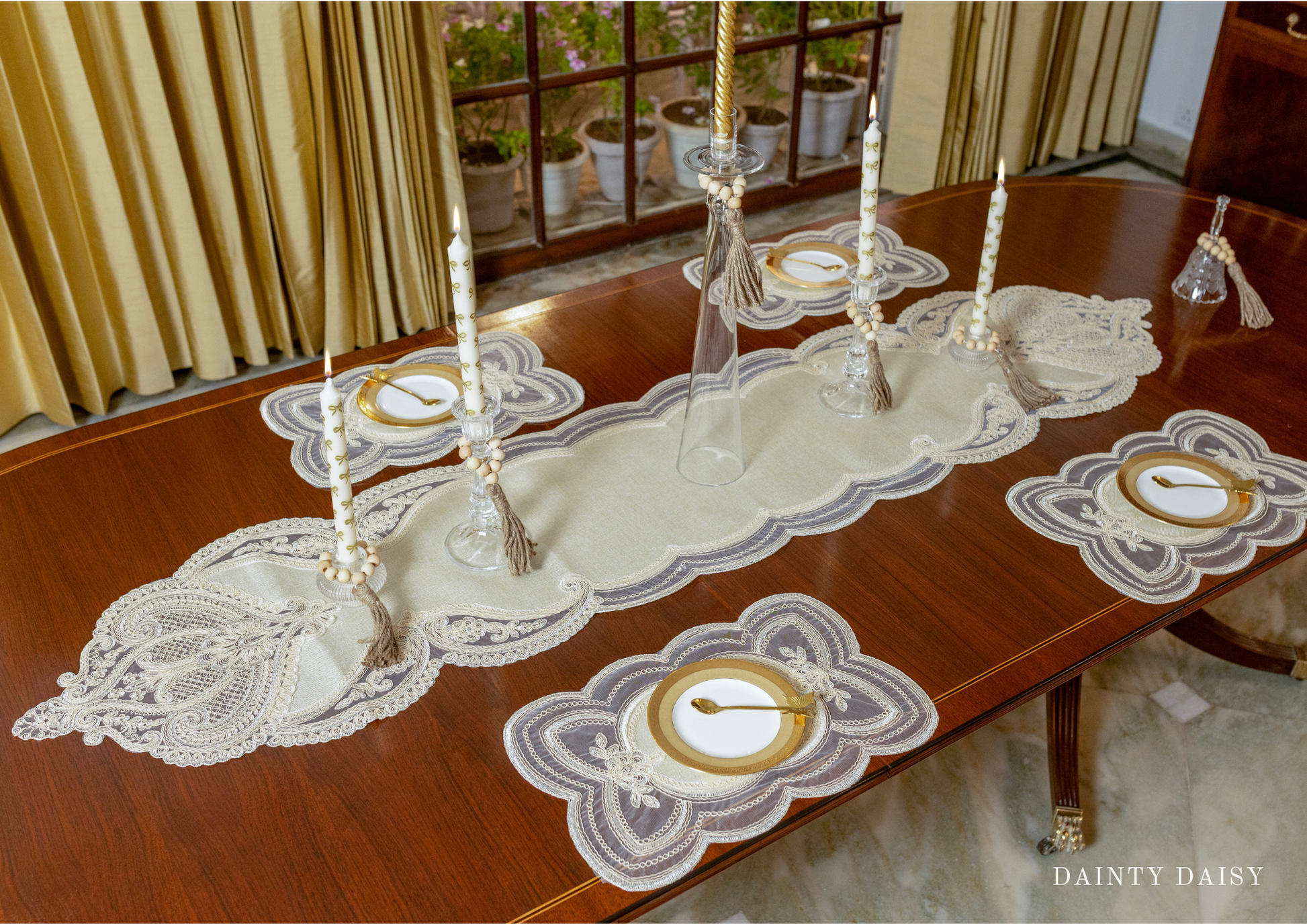 Let our Iris runner weave a tale of elegance along your table. Dainty Daisy’s soft pattern creates a harmonious dining atmosphere for six.